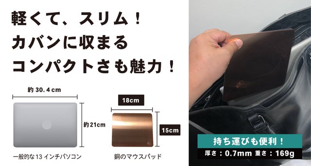 - 銅の抗菌・抗ウイルス効果に着目。手もとの安心を第一に考え「銅のマウスパッド」を作りました