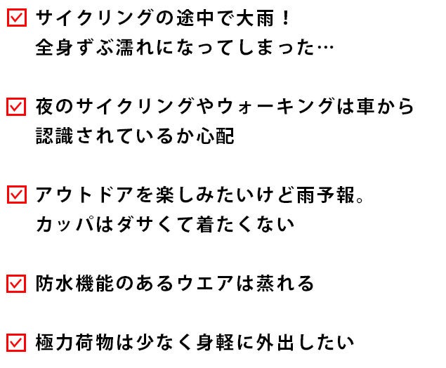 まさにこのコンセプト通り、今回のサイクリングレインパンツ&MOVEジャケット便利機能満載で、皆様に喜んでいただける商品となっております。どしゃ降りの雨のときに、傘をさしたり、レインコートを着ても服や靴がびしょびしょになってしまい、うんざりしてしまったことがあります。カッパにしても長時間着ているとすごく蒸れますし、とても不快に感じてました。皆さんもそんな経験ありませんか?