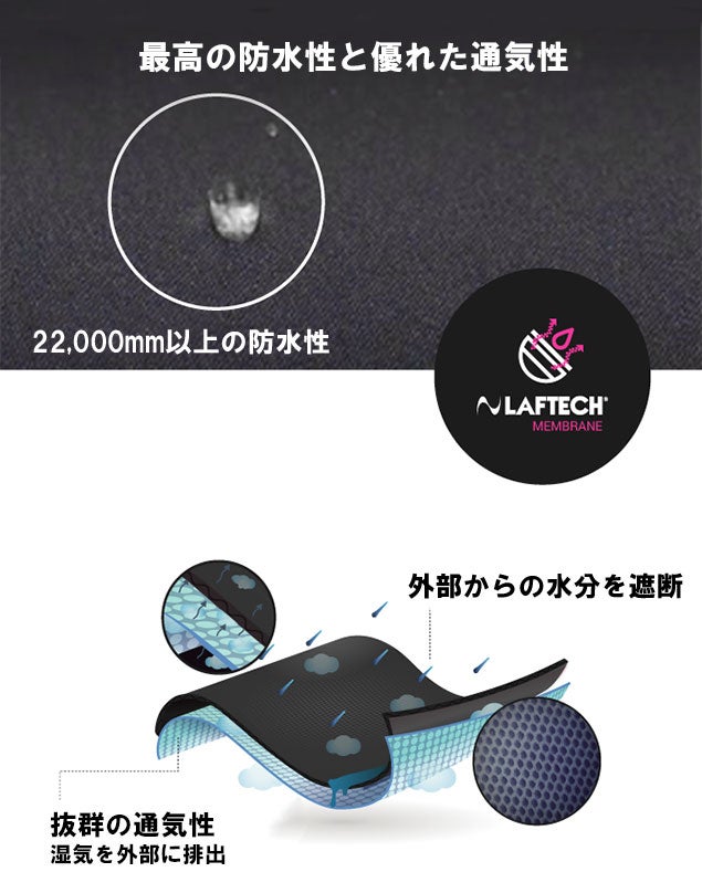 耐水圧は22,000mmにも及び、国際規格JISL1092の認証を得ている確かな防水能力が自慢です!