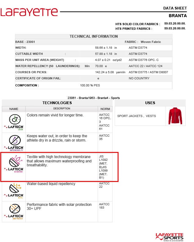 透湿性はおよそ18,000g/m/24時間と高い機能性を持ち、国際規格JISL1099の認証を得ています。