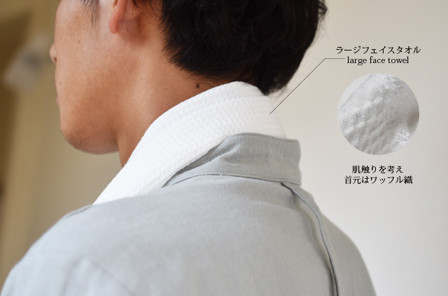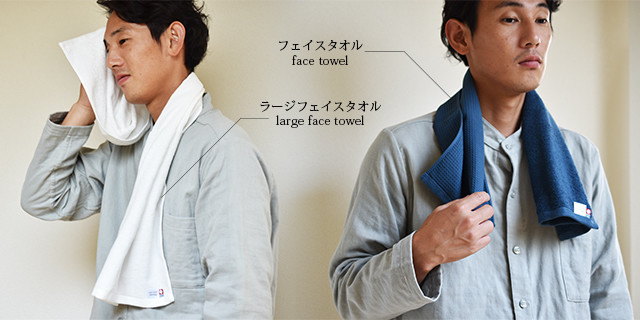 フェイスタオルより丈が長いラージフェイスタオルは男性や髪の長い女性にぴったり。顔や髪を拭く事が多いタオルの両サイドは吸水性を重視したふんわりパイル。中心部分はワッフル生地で熱も篭もらない。首に掛けると分かる「感動」。