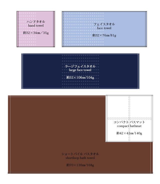 ■バスタオル×1枚、ラージフェイスタオル×1枚、フェイスタオル×1枚、ハンドタオル×1枚、バスマット×1枚