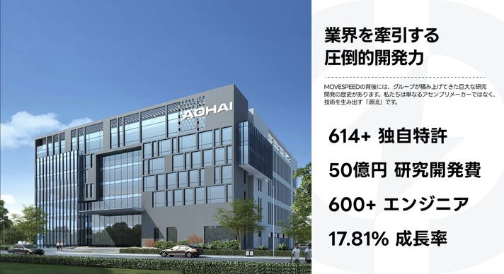 中国・深センに本社を置くMOVESPEED(移速科技)は、上場企業であるAOHAIのグループ傘下にある、個人コンシューマー向けハイエンド・イノベーションブランドです。設計、研究開発(R&D)、製造、販売を一貫して行う国家高新技術企業として、世界80以上の国と地域で1億人以上のユーザーに支持されています。