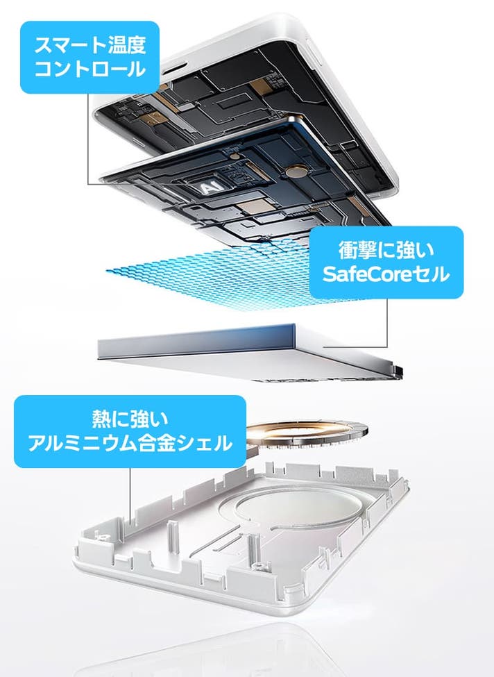 - 普段のデバイス充電から旅行まで幅広く使える、先進技術のモバイルバッテリー。