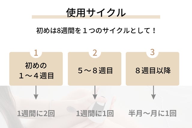 4週目までは週に2回、5-8週目の間は週に1回ご使用下さい。