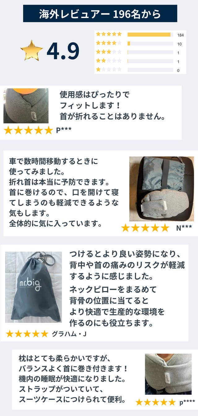 「mr.big」はよくあるビーズ型やエアー型のネックピローとは一段階違う、快適な寝心地を提供します。