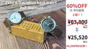 専用の紙箱付き・時計本体 TYPE A-7 aviation hack watch (20mm幅本革製クレージーホースストラップ 付)を2本。White と Black の組み合わせは選べます!保証書/マニュアルが入っています。なんと38,280円のお得!!