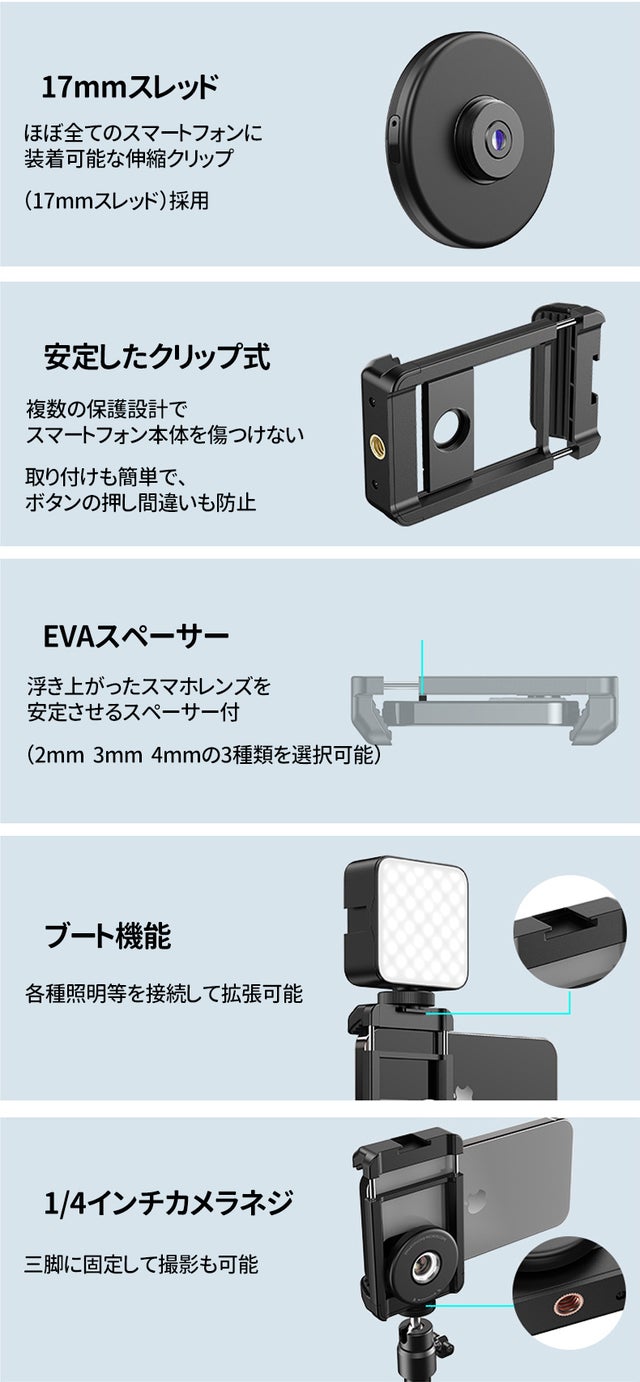 伸張クリップを広げてスマートフォンのカメラ部分に装着するだけの簡単設計。