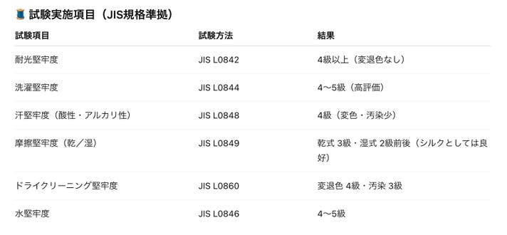 シルク素材として高水準の堅牢度と耐久性が確認されました。