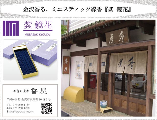 ミニスティック線香は金沢市のお香専門店『香屋』さんご協力いただき、エレガントなジャスミンが香る「紫 鏡花」を同封。性別年齢問わず、好まれる香りです。