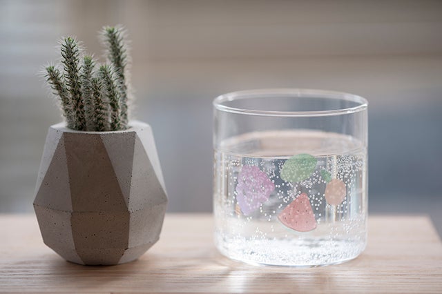 ↑透明な容器に貼り付け、クリスタルのような輝きと透明感を演出。。