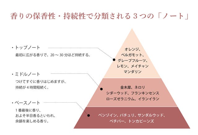 ブレンドについて、香りは揮発のスピードによって3つのノートに分類され、比較的香り立ちが良く、揮発が早い香りは「トップノート」、トップノートの次に揮発が早い香りは「ミドルノート」、香りが少し重めで、揮発が遅い香りは「ベースノート」に分けられます。