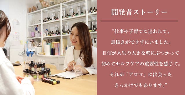 私(本商品の開発者)はRICCA.の調香師でもあるのですが、もともとはアロマとは無縁の企業勤めで、日々の業務や子育てに追われる日々を送っていました。