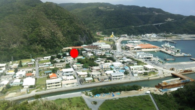 集落の東側。赤丸がカフェ予定地です。島の玄関口・渡嘉敷港から60m
