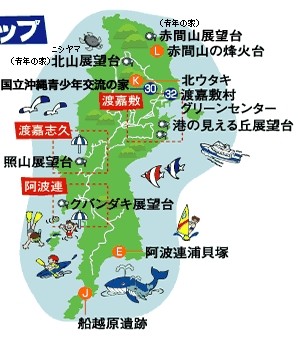 渡嘉敷村は大小10余りの島々からなり、その唯一の有人島が渡嘉敷島です。島は3つの集落に分かれ、港のある最大集落が渡嘉敷区、島の西部トカシクビーチを臨む渡嘉志久区、そして南西側にはアハレンビーチを有する阿波連区があります。