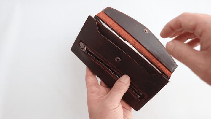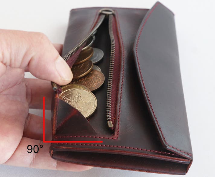 通常はミシンの都合で左にマチを付けますが、お札と小銭を同時に扱う際に見づらく取り出しにくいため、右側に直角に近く開くマチを設けました。視認性と取り出しやすさが大幅に向上しています。