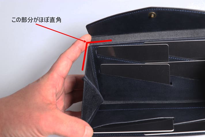 小さな長財布は横幅が狭いので入れる際にお札が両端がひっかかりやすく、スムーズに入れにくいという点があります。RICO Fit は財布を開いた際にマチがほぼ直角に曲がる為、引っ掛かりにくくなっています。