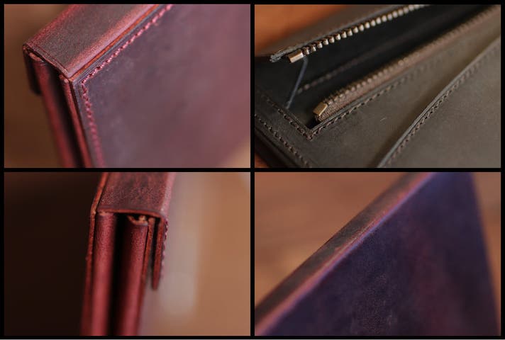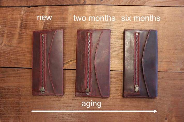 それに比べスモークドマットは傷は付きやすいですが、擦ると消える、時間と共に消えていく、染料で仕上げているので透明感があり、経年変化で色が濃くなりとても良い質感に変化していきます。育てて使う財布にぴったりの素材です。
