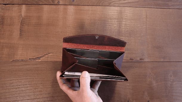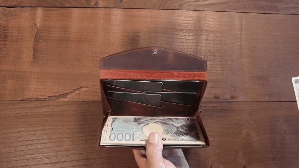 複数の一万円札を収納する際は奥側のマチを一旦外に開き、お札をまとめて収納した後、マチをもとに戻します。勝手に外側に開くことはありませんが、指で内側から軽く押し出すとポンと開きます。