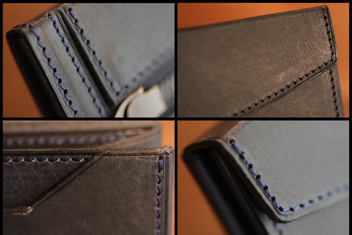 そこで考えたのが短いフラップ型の財布。一般的な物はフラップ自体に機能性を持たせるため、フラップの裏にカード段が付けます。
