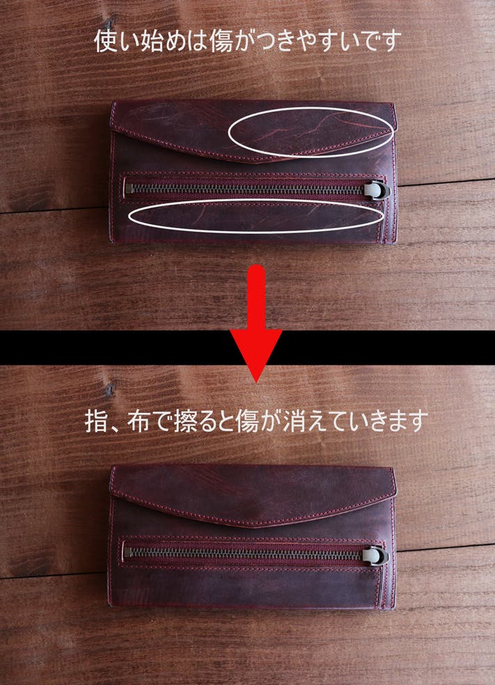使い始めて1.2か月目は傷が気になるかもしれません。使用していくうちに手の油が革に吸収され、色も濃くなり傷が自然と消えていきます。