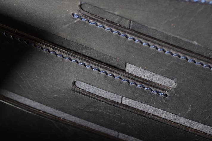 素材はイタリア産のスモークドマットという革を使用しています。その名前のとおりスモーキーでマットな質感です。バケッタ製法の※プルアップレザーです。通常のオイルではなくワックスでプルアップに仕上げているこの革はある程度の張りがあり、カチッとしたフォルムも出せます。と同時にしなやかさを併せ持ち、触った時の質感も良く、経年変化で艶も出る、作り手にも使い手にも利点のある革です。