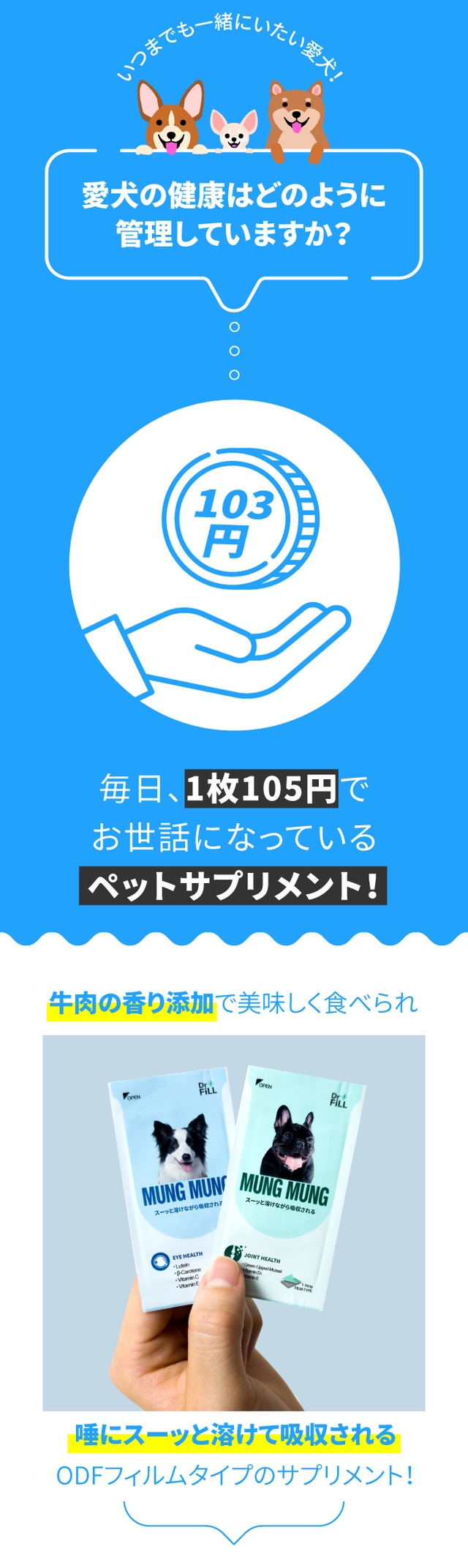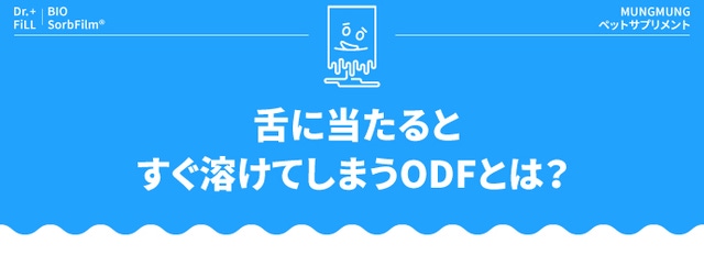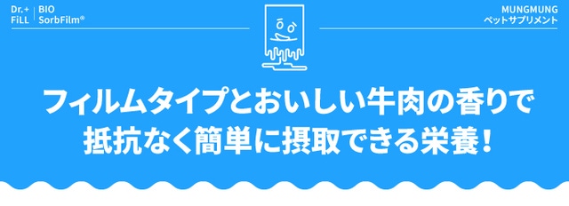 舌ですぐ溶けて栄養成分を体内に直接吸収できるODFフィルムのMUNGMUNGで 愛犬の健康をサポートします。