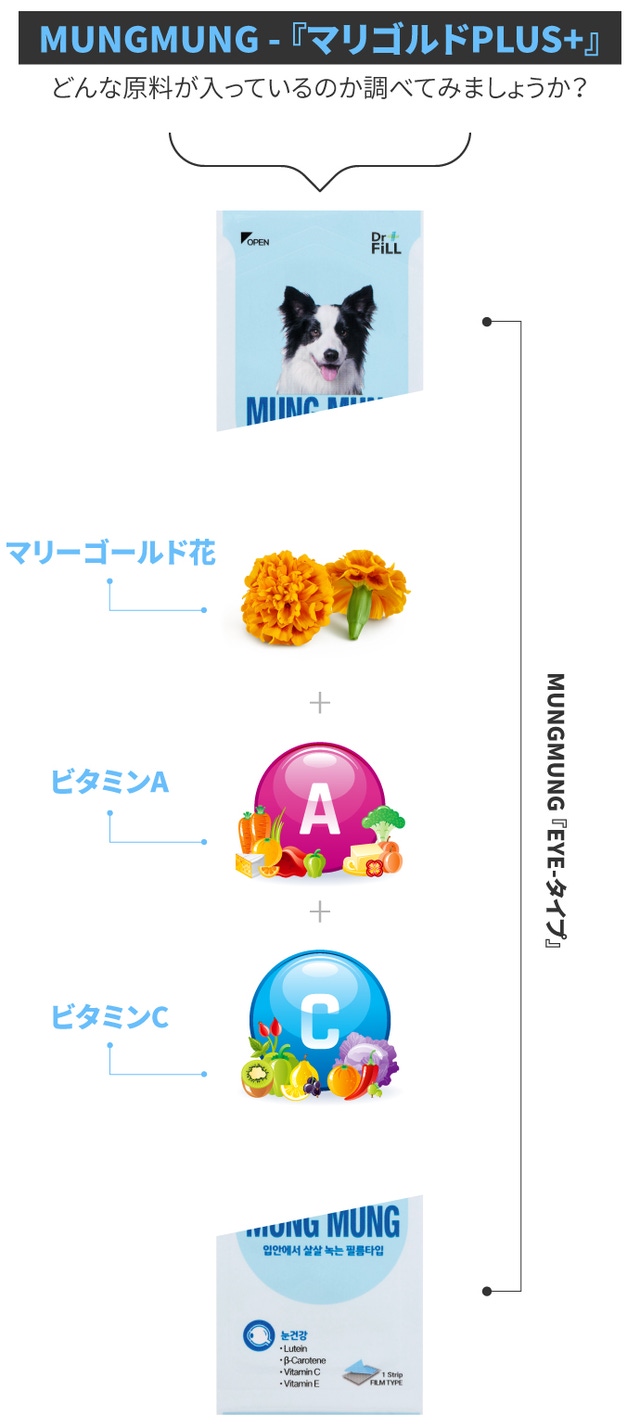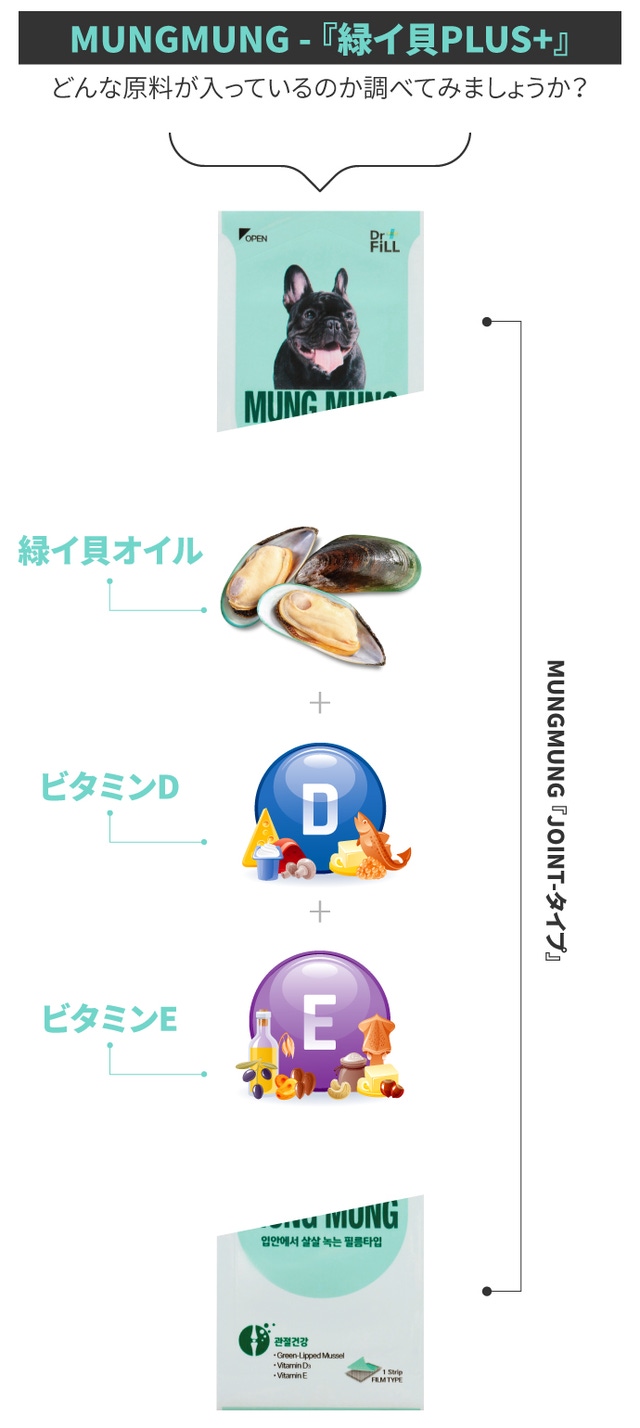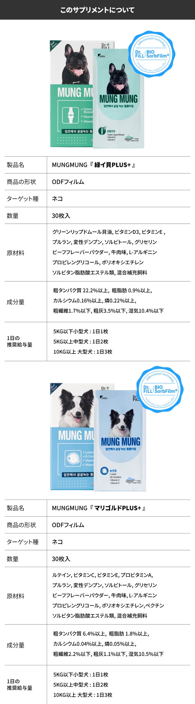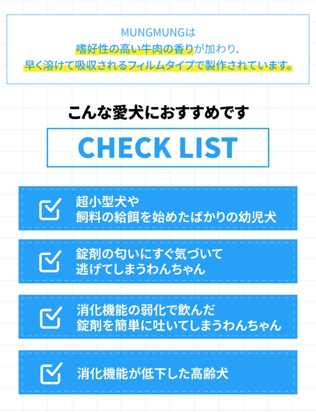 MUNGMUNGはこのような拒否感を減らすために舌に当たってすぐ溶けられるフィルムタイプで製作され愛犬がより簡単に栄養分を摂取できるようにサポートするサプリメントです。
