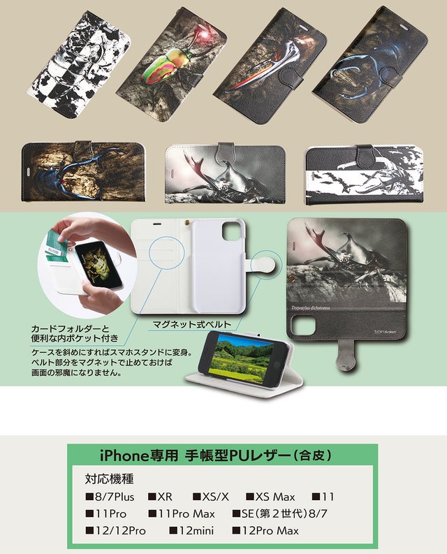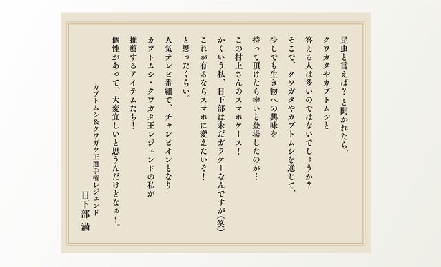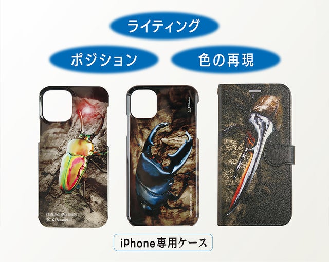 今回、スマホカバーケース、クリアファイル、バッグに使用した昆虫たちは、彼らの特徴、質感、躍動感にこだわり、真剣にムシたちと向き合い撮影してきたものです。商品化に当たり業者の方々のご協力もあり、すばらしい発色や質感などが表現されています。これらの商品を通じ小さなお子様から大人まで、クワガタやカブトムシを通じて会話が弾み親子、お友だちとワイワイ楽しい「和」がご提供出来ればと考えています。