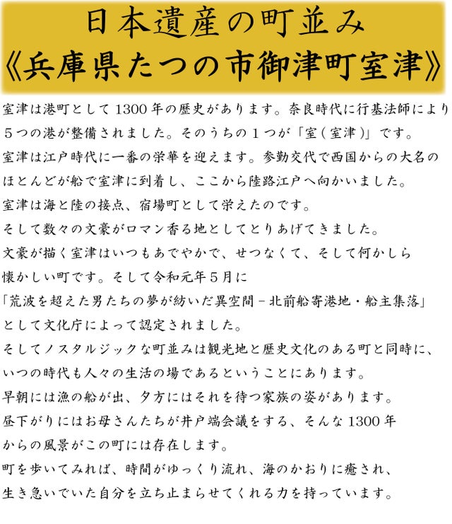 - 日本遺産の町並み『兵庫県たつの市室津』からお届け致します。