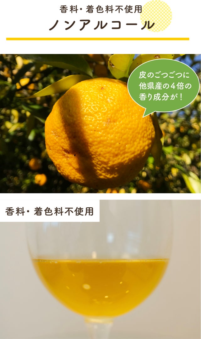 - 柚子の香りと旨味を引き出すために実と皮を別々に圧搾絞り。炭酸割りやお湯割りで楽しみ方いろいろ!