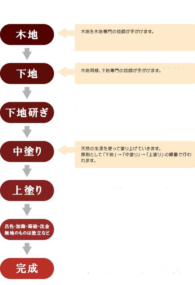 製品が仕上がるまでの工程は20~30以上におよび、ひとつの製品が仕上がるまでに、最低でも4~6ヶ月ほどかかります。 各工程によって職人さんは変わり、木地は木地の職人さんが、下地は下地の職人さんが、塗りは塗の職人さんが…と、ひとつひとつの工程で手がける人間が変わるのが一般的です。