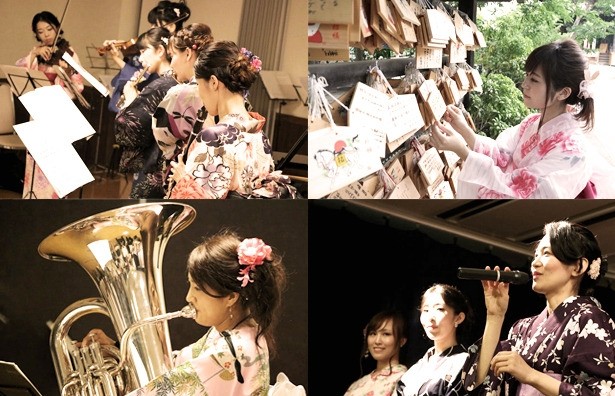 神社の本殿で全員浴衣を着用し、古き良き日本の伝統歌曲を披露。