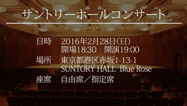 2016年2月28日(日)にサントリーホールで公演を予定しております。これまでで最も洗練された環境で、生演奏をお楽しみいただけます。