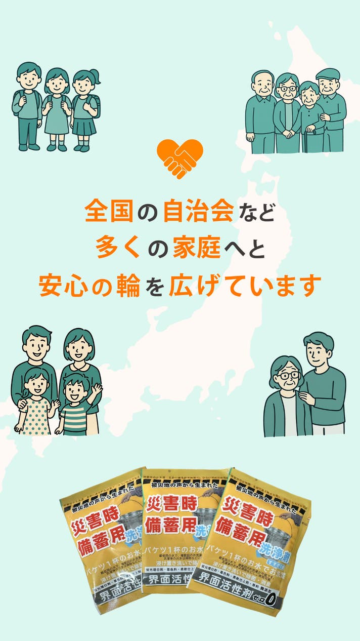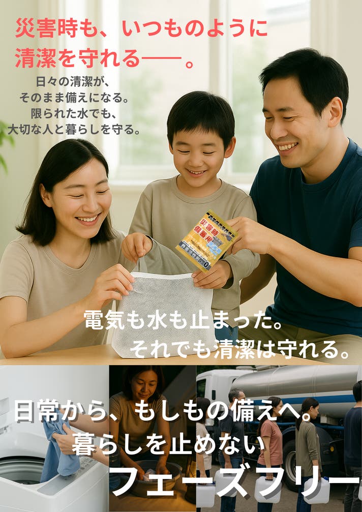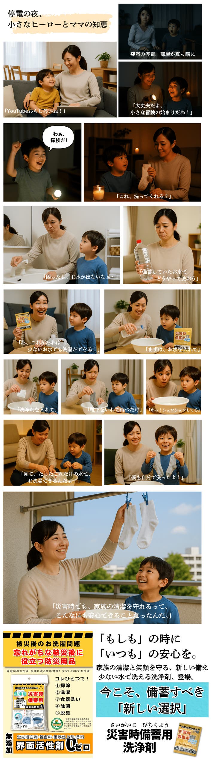 「断水はすぐに終わるだろう」と多くの人が考えがちですが、現実は異なります。能登半島のように、半年以上経っても洗濯の問題は解決できていないのです。これこそが、私たちが開発した「被災者の声から生まれた」災害時備蓄用多機能洗浄剤の原点です。この製品は、災害時でも少ない水でしっかり洗浄でき、被災者の切実なニーズを解決するために生まれました。