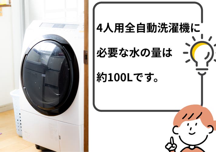 一般的に、4人家族が使う全自動洗濯機(10kg用)では、1回の洗濯に約100Lもの水を必要とします。