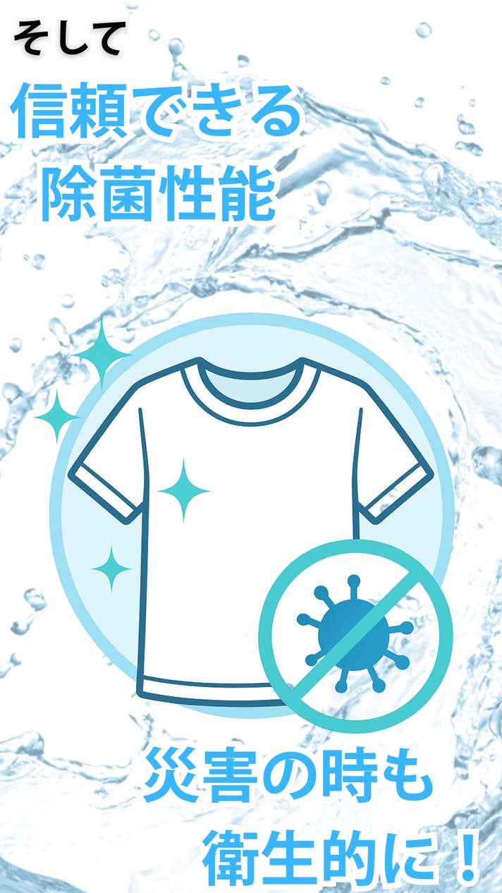 この強力な除菌力は、災害時に衛生環境を保ち、健康リスクを最小限に抑えるために非常に重要です。限られた水で清潔を維持し、安心してお使いいただけます。