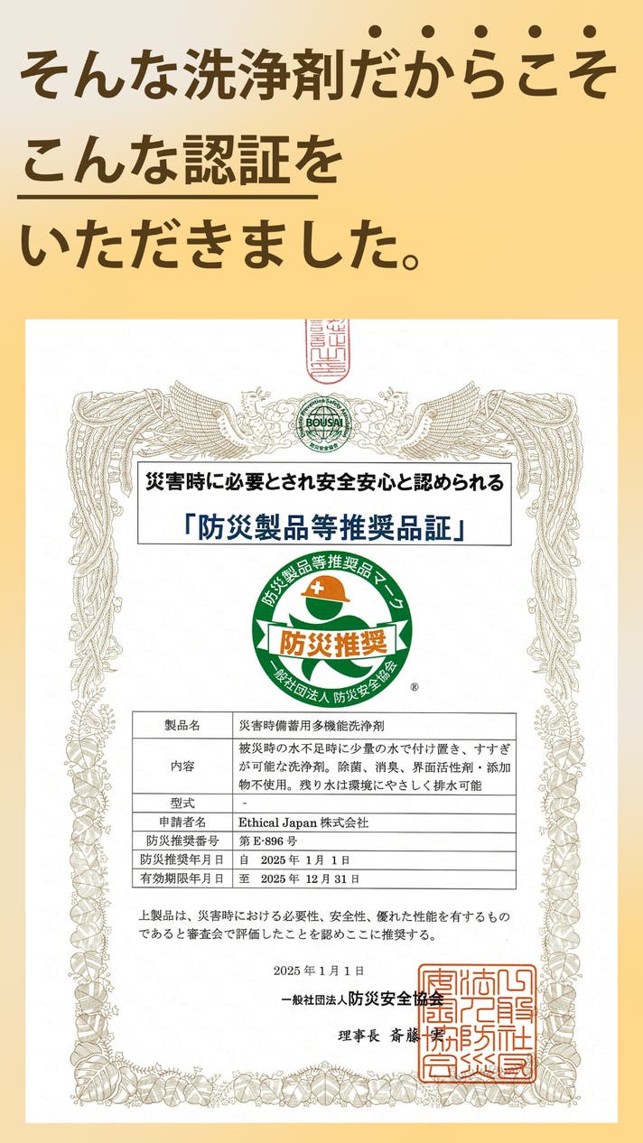 「災害時備蓄用多機能洗浄剤」で、被災時でも安心・清潔を守る!