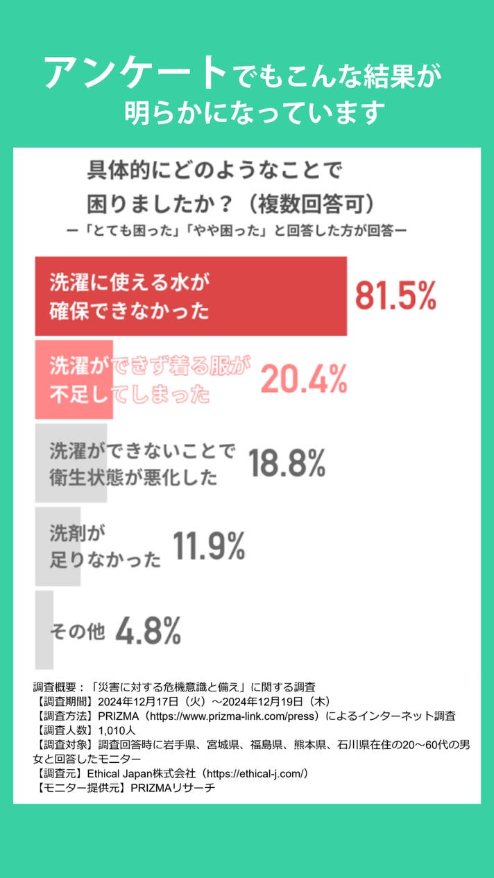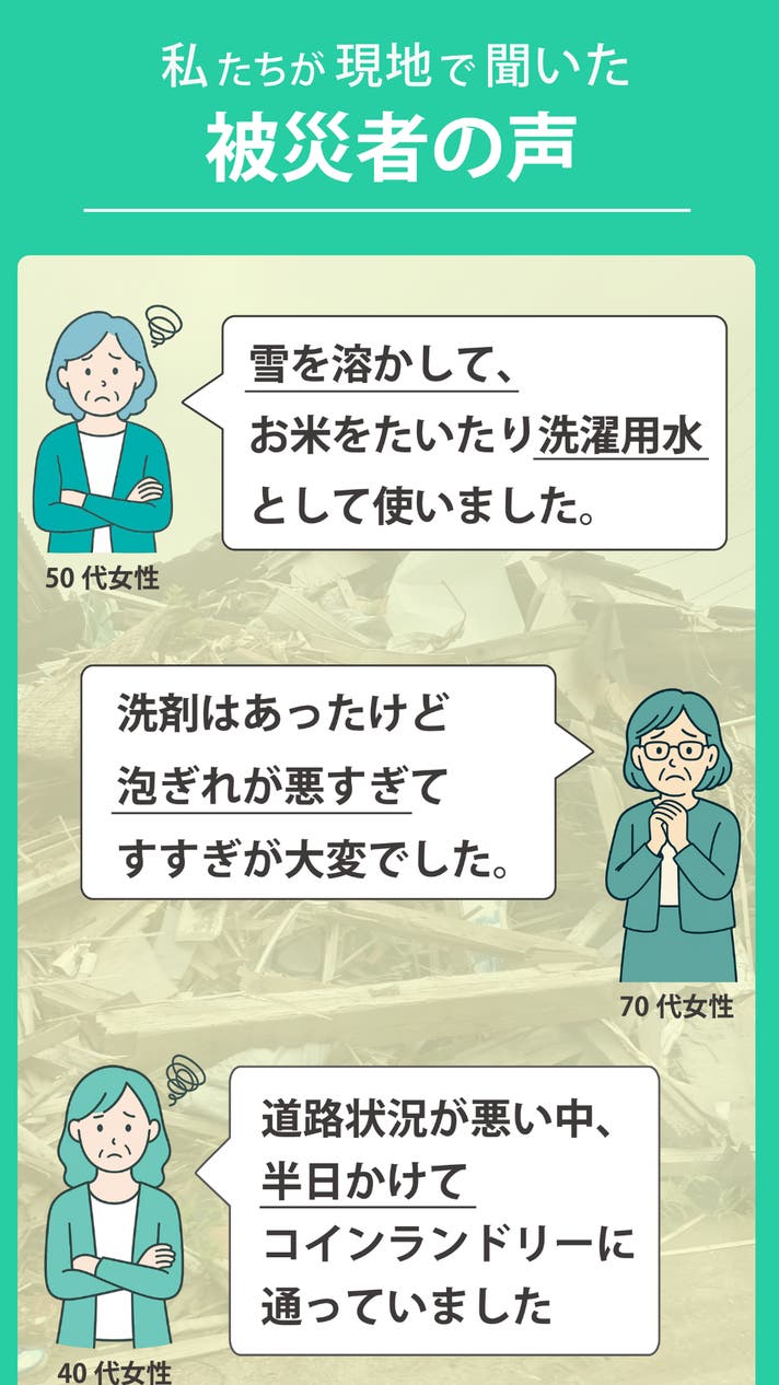 そのため、災害時の限られた水での暮らしにおいて、洗濯こそが最大の負担となっていたのです。
