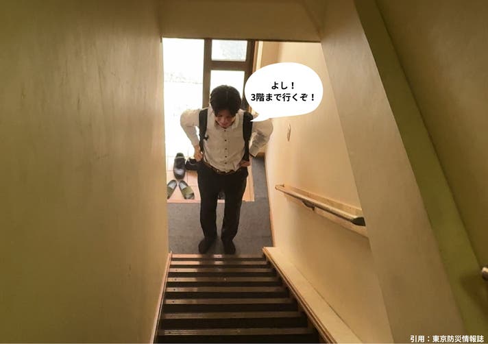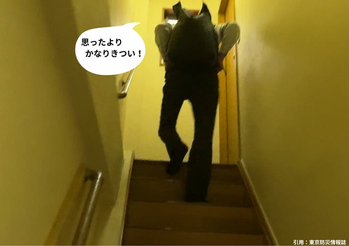 ここでは20Lの水約20kgを背中に背負って3階まで登ってみます。