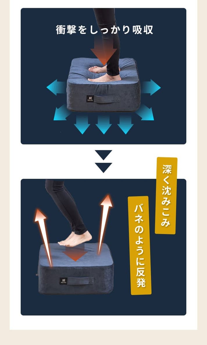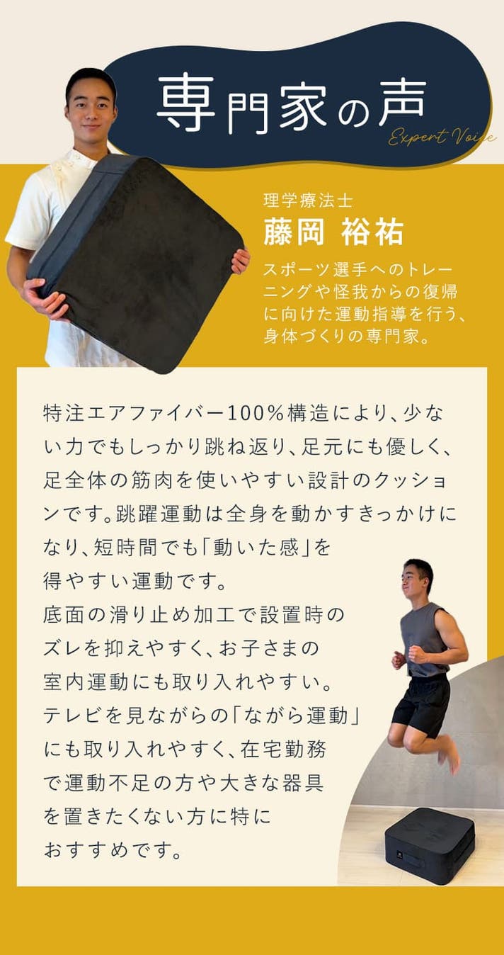特に今回、私たちが最も時間をかけ、こだわり抜いたのが「驚くほどの跳ねやすさ」です。 「クッション型トランポリンなんて、どれも同じでは?」と思われるかもしれません。しかし、私たちは工場と何度も試作を重ね、エアファイバーの密度を極限まで調整し、他にはない反発力を実現することにこだわりました。なぜなら、しっかり跳ね返ってくる感覚こそが、運動を「辛いもの」から「ワクワクするもの」に変えてくれると確信しているからです。