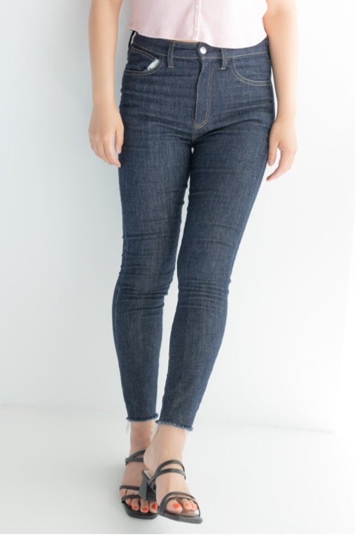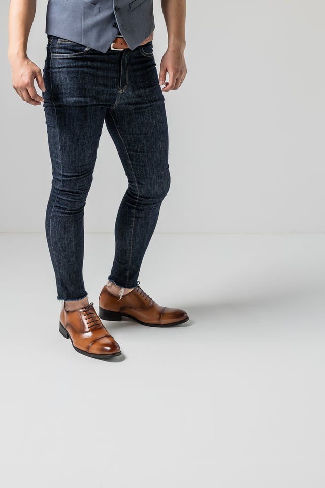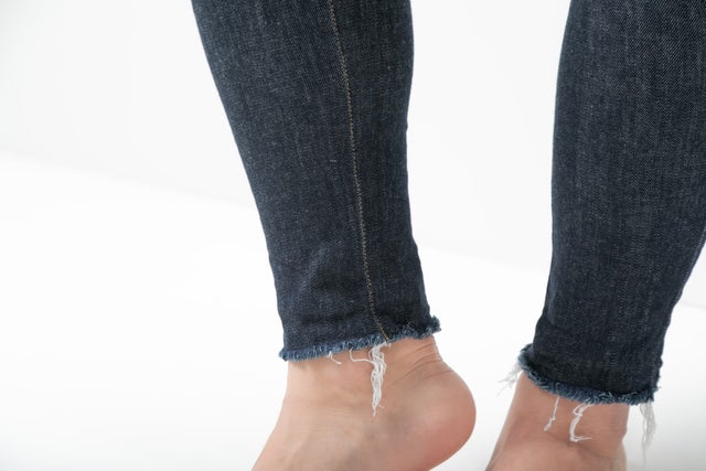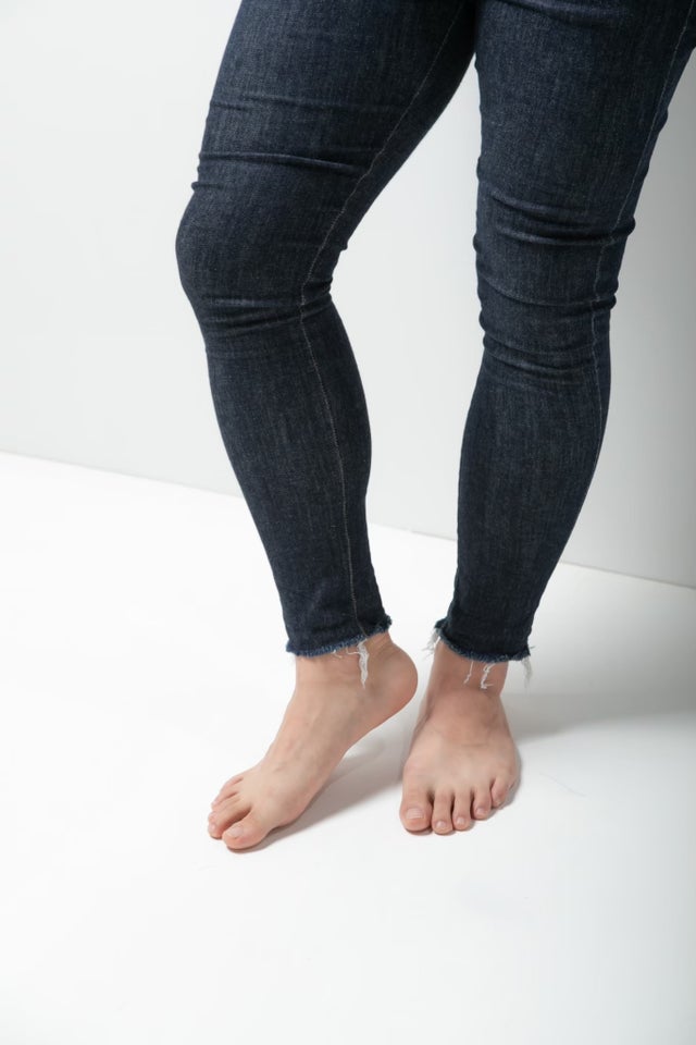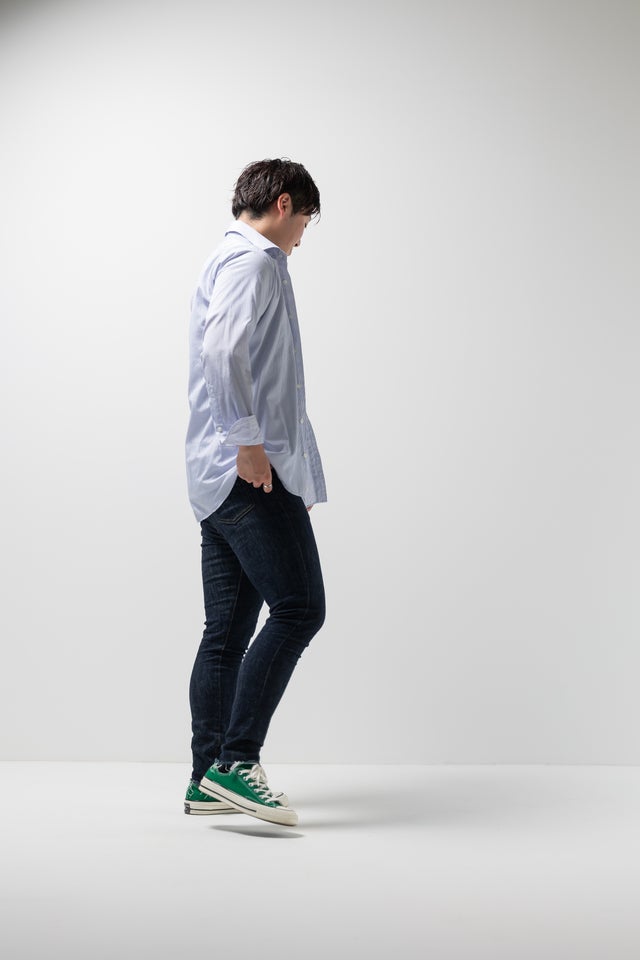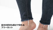 パンツの裾の長さは自分の好きな長さで切れる仕様になっています。どこの長さで切っても締まりのあるデザインになるようにしています。好きな長さに合わせて切り、切った後は切りっぱなしのスキニーとしても、また切りっぱなしだけでなくロールアップすることで雰囲気を変えて履くことができます。
