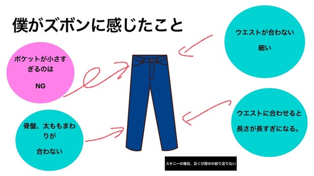 自らもコンプレックスを抱えており、それを踏まえて同じ悩みを持っている人のなにか力になりたい。特に僕はズボン選びに苦労してきたのでまずはズボンをつくりました!スキニーズボンだけでなく様々なバリエーションの服を作っていきたいと思っています。
