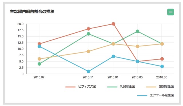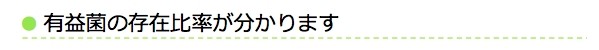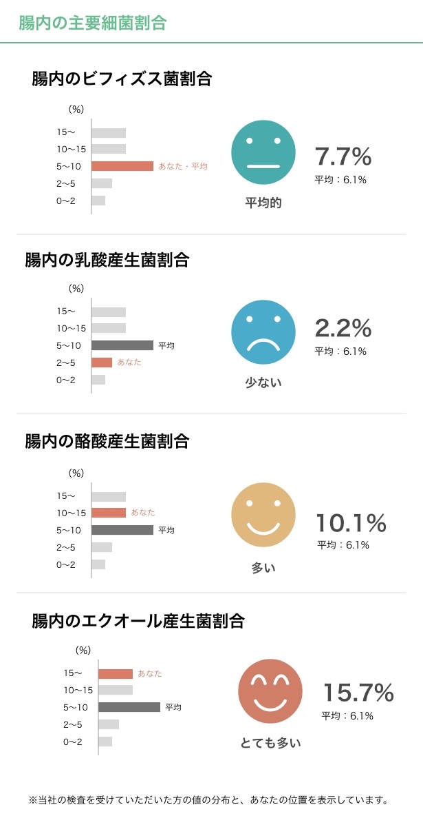 有益菌の代表格として知られるビフィズス菌の他、乳酸産生菌や、近年新たに注目を集めている酪酸産生菌、エクオール産生菌の割合を表示します。