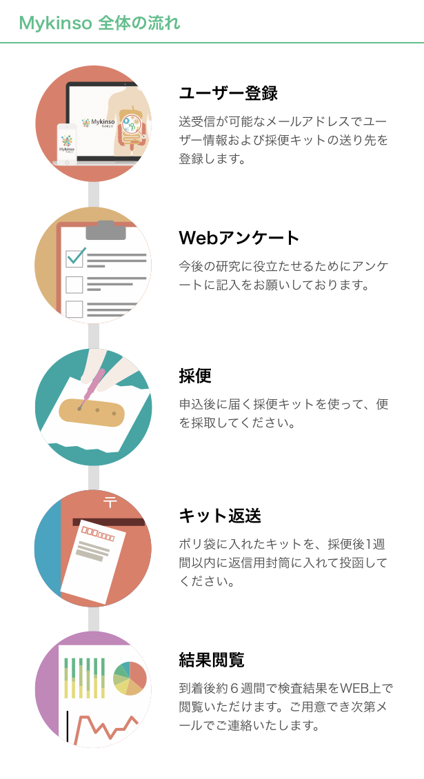 腸内環境を簡単に可視化し、自分のライフスタイルを考えるきっかけとなる画期的なサービスを作りたい!との思いから、Mykinso(マイキンソー)は生まれました。