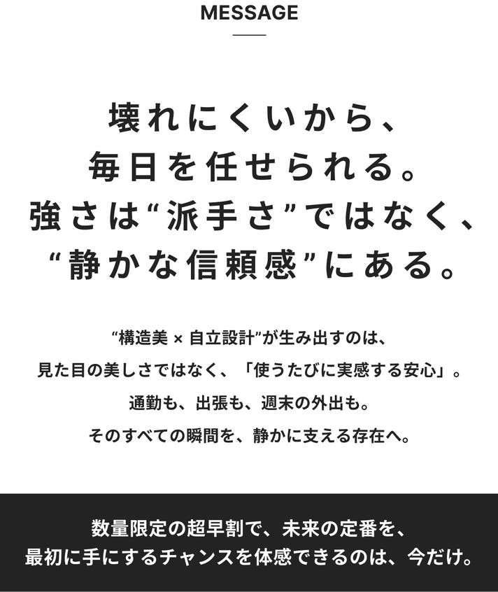 壊れにくい“構造美”を追求したこのトートが、毎日の通勤や出張、そして人生のさまざまな場面で、長く寄り添う相棒になることを願っています。