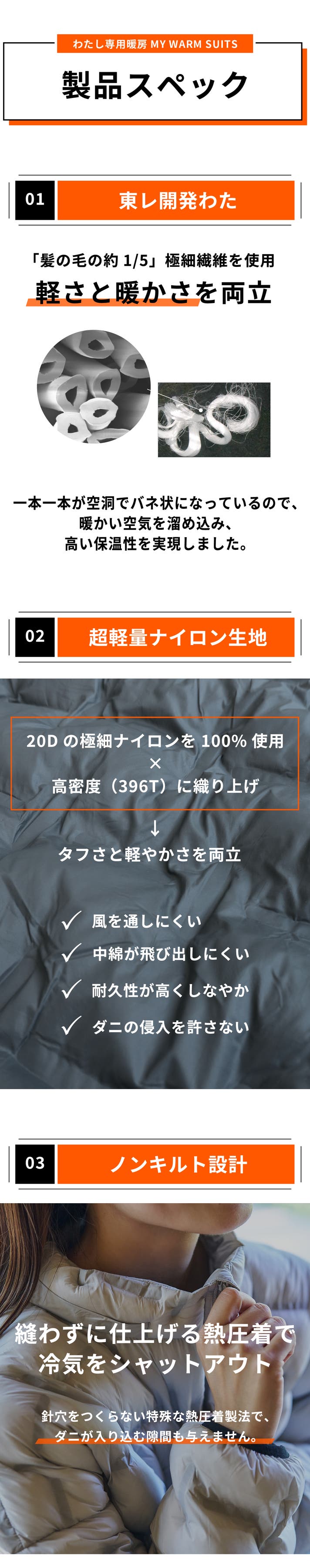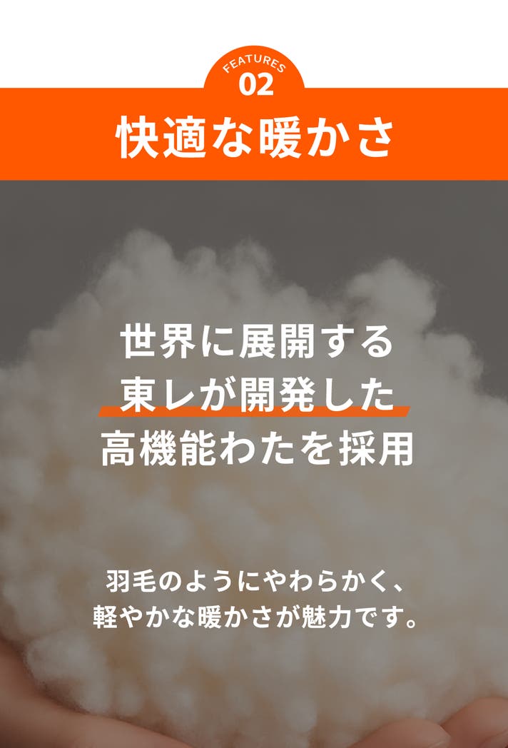 - 【世界に展開する東レが開発】軽さと暖かさを両立させた高機能わたを採用。