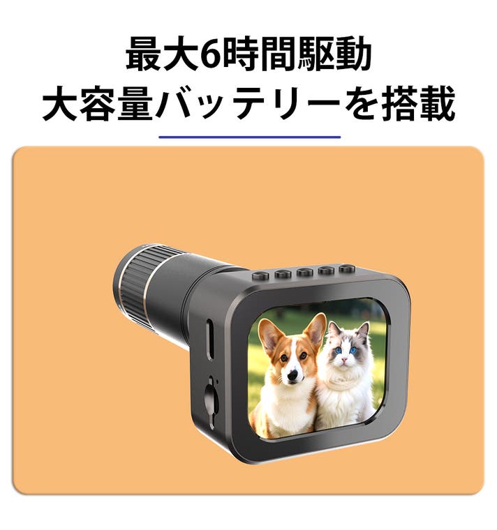 長時間の連続撮影に対応しており、最長6時間のロングバッテリー設計が魅力です。外出先でも充電残量を気にせず使い続けられるので、旅行や運動会など長丁場のイベントでもバッテリー切れの不安なく撮影できます。