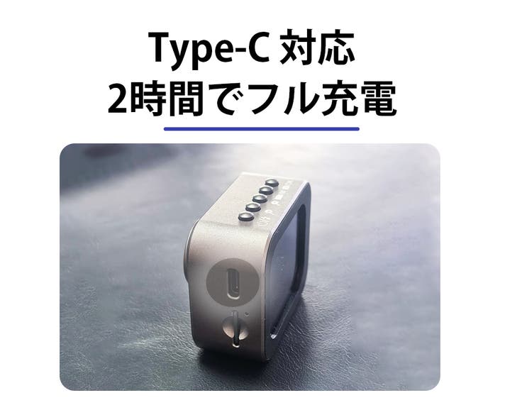 Type-C充電に対応しており、約2時間でフル充電できるスピード設計です。撮影の合間でも短時間で効率よく充電でき、忙しい外出時でもすぐに使える状態を保てます。