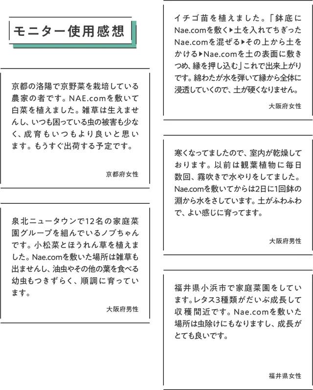 アパレル業界で50年以上洋服を製造。某アパレル本社の植物群に感銘を受けてスタートしたガーデニングを40年以上つづける。植物を育てる際の悩みの解決と環境負荷の軽減に対し、自身のアパレル製造の知見を生かせないかと考えるようになる。明治生まれの祖父が使用不能になるまで使った布団を細かくして畑に撒いていたことを思い出し、単独で栽培シートの開発にとりかかる。2年間かけてNae.comを完成。今後も植物を通して環境負荷減らす製品を作っていく。